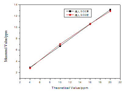 圖6為該分析儀的抗SO2氣體干擾性能測試結(jié)果,橫軸為氨氣濃度的理論值,縱軸為實測值,紅色數(shù)據(jù)點為氨氣單一氣體的濃度實測值,黑色數(shù)據(jù)點混入SO2氣體之后氨氣濃度的實測值。測試中用兩臺質(zhì)量流量計控制標(biāo)準(zhǔn)濃度氨氣和氮氣的混合比例來獲得不同濃度的氨氣。對應(yīng)氨氣濃度為4、10、16、20ppm,分別混入SO2濃度為60、68、80、96mg/m3。如圖6所示,混入SO2氣體前后對氨氣濃度值的測量并沒有影響。而且,可以看出實測數(shù)據(jù)值有很好的線性度。最后通過數(shù)據(jù)修正可獲得準(zhǔn)確的接近理論值的氨氣濃度。