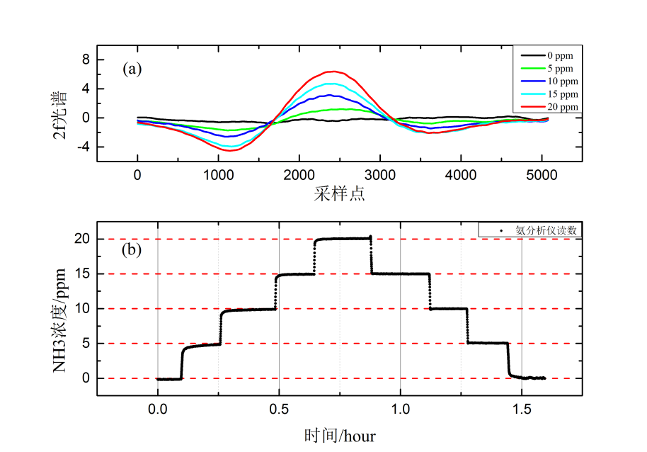 圖7 濃度梯度測試(a)不同濃度的2f光譜(b)分析儀測量氨氣濃度梯度