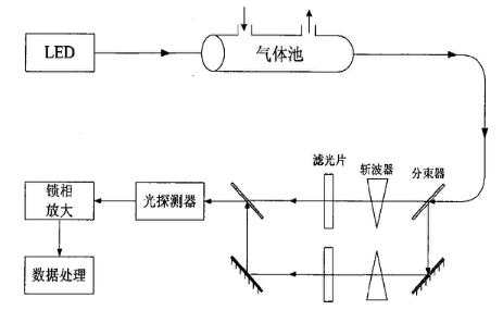DOAS主要利用吸收分子在紫外到可見光波段的窄帶吸收強度通過朗伯-比爾定律來推演氣體的濃度,其特點在于根據(jù)被測氣體在所選波段上的頻率特性,將吸收截面分成兩部分,隨波長快速變化的窄帶吸收截面和隨波長緩慢變化的寬帶吸收截面。將透射光強與原始光強對比,得到對比的吸收度,利用多項式擬合出一條吸收度慢變化曲線,然后將慢變化曲線從吸收度中減去,便可得到差分吸收度的信號,將差分吸收度與分子的吸收截面進行擬合,可計算得到待測氣體的濃度值。如圖4,氘燈發(fā)射寬光譜光源,經(jīng)氣體吸收后的光被分束器分成2束光路,斬波器對光路進行調(diào)制,濾光片使2束光路分別通過不同的波長,最后在鎖相放大器中解調(diào)獲得氣體濃度。