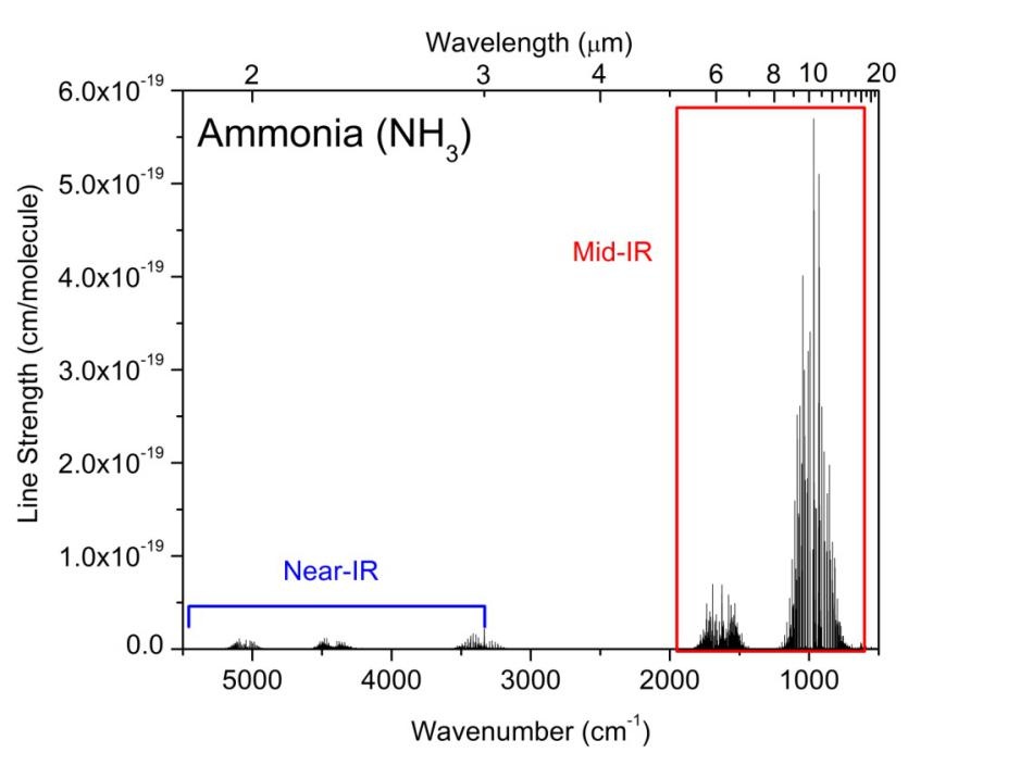 圖1 NH3在近紅外波段(藍色框)比中紅外波段(紅色框)的吸收譜線弱近100倍
