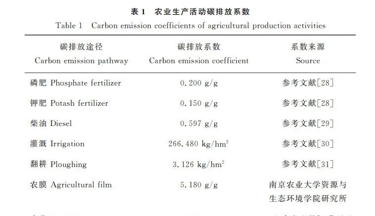 式中:Tj為第j種農(nóng)業(yè)投入量,kg;EFj為第j種農(nóng)業(yè)投入碳排放系數(shù),如表1所示;44/12為CO2與C分子量之比。