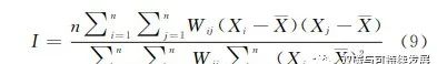 式中:I為全局Moran指數(shù);n為省(市、自治區(qū))數(shù)量;Xi為第i個(gè)省(市、自治區(qū))的碳排放強(qiáng)度;Wij為空間單位i和j的權(quán)重;X為研究對象碳排放強(qiáng)度的平均值。