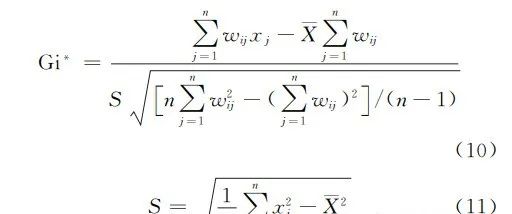 Getis Ord(Gi*)可以測量指定研究區(qū)域的高值(熱點(diǎn))和低值(冷點(diǎn))密度,計(jì)算方法如下: