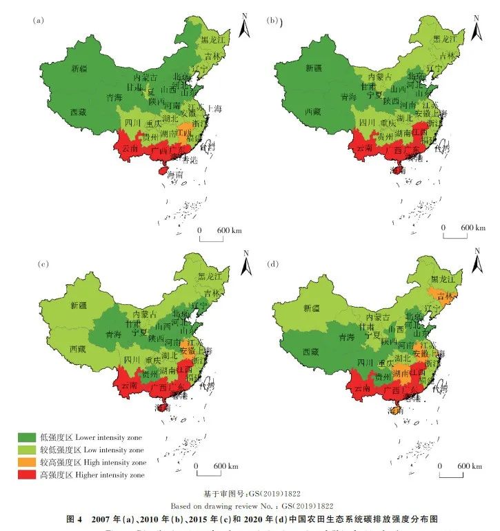 為了便于分析比較中國各省(市、自治區(qū))的農(nóng)田生態(tài)系統(tǒng)碳排放強(qiáng)度差異,對中國農(nóng)田生態(tài)系統(tǒng)碳排放強(qiáng)度進(jìn)行標(biāo)準(zhǔn)化處理,參考陳慧等[39]的劃分方法,即以當(dāng)年農(nóng)田生態(tài)系統(tǒng)碳排放強(qiáng)度均值的0.5、1.0、1.5倍作為3個(gè)分界點(diǎn),將各省(市、自治區(qū))農(nóng)田生態(tài)系統(tǒng)碳排放強(qiáng)度從低到高依次劃分為低強(qiáng)度區(qū)、較低強(qiáng)度區(qū)、較高強(qiáng)度區(qū)和高強(qiáng)度區(qū)4個(gè)等級。利用ArcGIS10.2軟件的空間分析功能刻畫2007年、2010年、2015年和2020年中國農(nóng)田生態(tài)系統(tǒng)碳排放強(qiáng)度分布,結(jié)果如圖4所示??梢?/span>,不同時(shí)期中國各省(市、自治區(qū))農(nóng)田生態(tài)系統(tǒng)碳排放強(qiáng)度空間差異十分顯著:高強(qiáng)度區(qū)主要集中在中國南部的廣西、廣東和云南省,總碳排放量由2007年的3.9786億t減少到2020年的3.9345億t,分別占當(dāng)年中國農(nóng)田生態(tài)系統(tǒng)碳排放總量的46.26%和46.48%。2007年高排放區(qū)為云南、廣東、廣西和海南,2010年、2015年高排放區(qū)為云南、廣東、廣西、海南、江西,2020年高排放區(qū)為云南、廣東、廣西和江西。廣西壯族自治區(qū)盛產(chǎn)甘蔗、且N2O排放因子較高,造成N2O排放量高于其他省(市、自治區(qū)),加之廣西壯族自治區(qū)化肥農(nóng)藥施用較多,因而廣西壯族自治區(qū)碳排放強(qiáng)度一直位于中國首位。此外,江西、廣東、廣西等地水稻占有舉足輕重的地位,因此CH4排放較多,碳排放強(qiáng)度隨之升高。