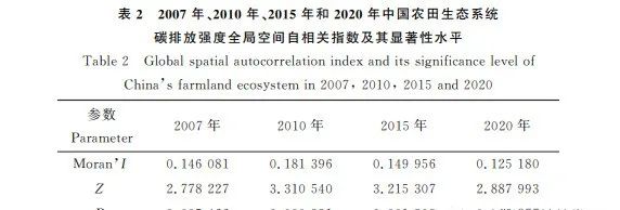 在農(nóng)田生態(tài)系統(tǒng)碳排放時(shí)空格局研究方面,袁霄等[13]采用空間自相關(guān)分析了土地利用碳排放時(shí)空格局,發(fā)現(xiàn)重慶市重度排放集中在主城核心區(qū),中輕度排放集中在主城拓展區(qū)、環(huán)主城區(qū)及區(qū)域中心城市;翁翎燕等[14]使用了空間自相關(guān)方法研究得出江蘇省農(nóng)田植被凈碳匯呈現(xiàn)出“北熱南冷”的空間格局;Pang等[15]采用了空間自相關(guān)分析得出中國農(nóng)業(yè)生產(chǎn)碳排放強(qiáng)度呈現(xiàn)空間聚集趨勢;夏四友等[16]運(yùn)用Theil指數(shù)及空間自相關(guān)方法分析了農(nóng)業(yè)碳排放強(qiáng)度時(shí)空格局特征,研究表明未來碳排放強(qiáng)度值將呈現(xiàn)出繼續(xù)下降的演化態(tài)勢;孫小祥等[17]構(gòu)建了生態(tài)承載效率指數(shù)、經(jīng)濟(jì)貢獻(xiàn)效率指數(shù),發(fā)現(xiàn)江蘇沿海地區(qū)農(nóng)田生態(tài)系統(tǒng)碳源/匯動態(tài)區(qū)域差異較大。綜上所述,空間自相關(guān)分析因能準(zhǔn)確識別變量在不同空間尺度的分布情況,目前已被廣泛應(yīng)用于農(nóng)業(yè)碳排放時(shí)空格局研究。