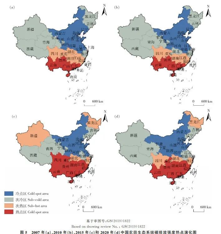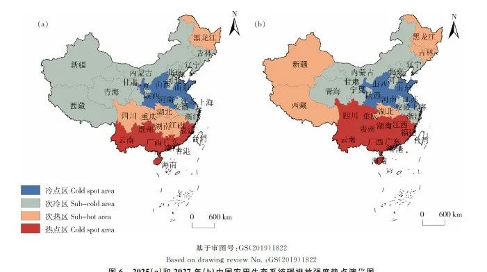 從整體結(jié)構(gòu)看,未來6年中國農(nóng)田生態(tài)系統(tǒng)碳排放強(qiáng)度總體仍呈現(xiàn)“北冷南熱”的空間格局。從區(qū)域尺度來看,中國南部地區(qū)熱度依舊高于北部地區(qū);華北地區(qū)、西部地區(qū)熱度上升。從4種變化類型來看,中國熱點(diǎn)區(qū)先縮小后擴(kuò)大,整體呈擴(kuò)散趨勢;次熱點(diǎn)區(qū)域數(shù)量保持穩(wěn)定,但逐漸向西部擴(kuò)散;次冷點(diǎn)區(qū)域先擴(kuò)大后縮小,整體數(shù)量保持穩(wěn)定但逐漸集中;冷點(diǎn)區(qū)域不斷縮小,整體向東南方向移動。