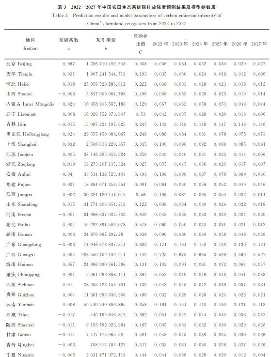 根據(jù)2007—2020年中國各省(市、自治區(qū))農(nóng)田生態(tài)系統(tǒng)碳排放強(qiáng)度,運(yùn)用SPSS軟件求得發(fā)展系數(shù)a、灰作用量b,進(jìn)而構(gòu)建灰色預(yù)測模型預(yù)測2022—2027年中國各省(市、自治區(qū))農(nóng)田生態(tài)系統(tǒng)碳排放強(qiáng)度,通過后驗(yàn)差比值C檢驗(yàn)?zāi)P途?。模型參?shù)及預(yù)測結(jié)果見表3,根據(jù)精度等級劃分的原則,可知各省(市、自治區(qū))灰色預(yù)測模型均合格有效。
