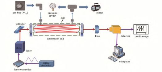 實驗利用高分辨量子級聯(lián)激光吸收光譜技術對7.8μm波段trans-HONO和N2O4的吸收光譜進行了同時測量,對兩種氣體的吸收線頻率進行了確定?;诹孔蛹壜?lián)激光器和50m長光程吸收池的實驗裝置如圖所示。