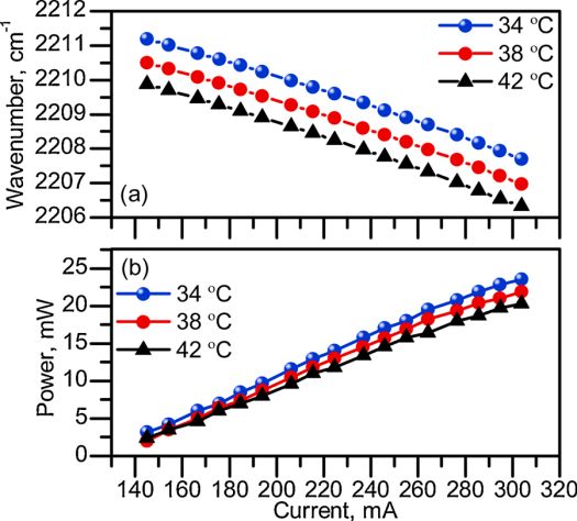 通過改變溫度和電流,QCL的波長(zhǎng)可以在2206.3 cm?1至2211.2 cm?1之間進(jìn)行調(diào)諧(圖2(a))。圖2(b)顯示了在不同工作溫度下QCL輸出功率與電流之間的關(guān)系。