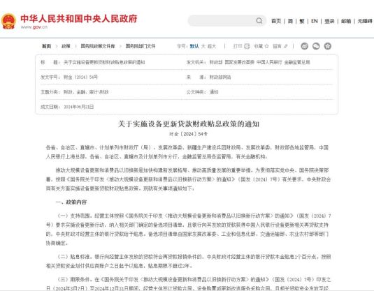 近日,財(cái)政部發(fā)布《關(guān)于實(shí)施設(shè)備更新貸款財(cái)政貼息政策的通知》(財(cái)金〔2024〕54號(hào)),為設(shè)備更新貸款提供財(cái)政貼息支持,進(jìn)一步推動(dòng)設(shè)備更新和消費(fèi)品以舊換新。此政策明確了支持范圍、貼息標(biāo)準(zhǔn)、期限條件等關(guān)鍵內(nèi)容,對(duì)符合條件的經(jīng)營(yíng)主體提供貸款貼息,有效減輕了企業(yè)的財(cái)務(wù)負(fù)擔(dān),加速了設(shè)備更新的進(jìn)程。