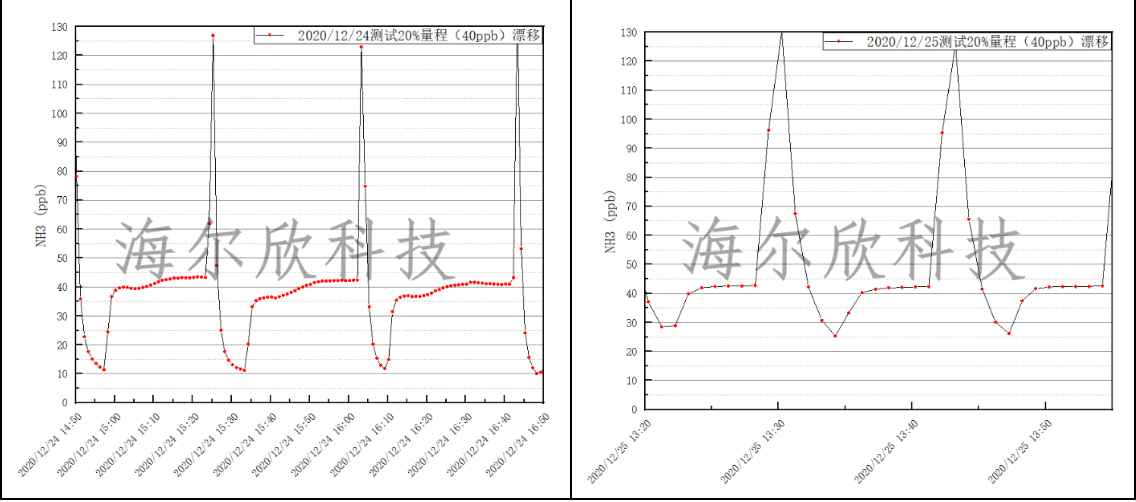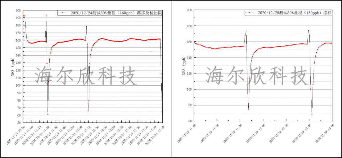 漂移:按 HJ654-2013 的測(cè)試要求計(jì)算 24h的零點(diǎn)漂移、20%量程漂移和80%量程漂移。測(cè)試如下圖。