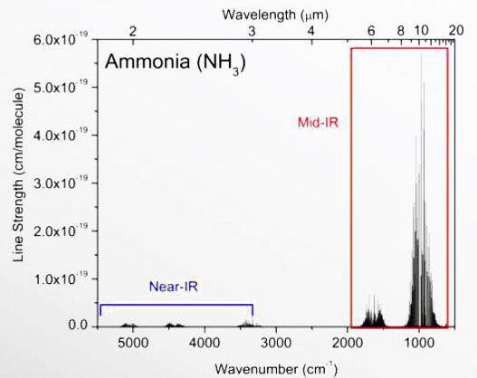 氨氣分子近紅外(藍(lán)色)與中紅外(紅色)光譜強(qiáng)度對(duì)比