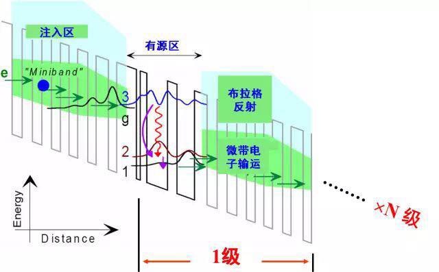 量子級(jí)聯(lián)激光器能帶結(jié)構(gòu)和工作原理示意圖