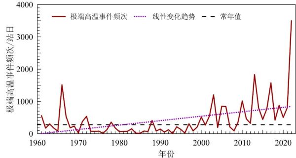 中國升溫速率高于同期全球水平,極端高溫事件頻發(fā)趨強。1901~2022年,中國地表年平均氣溫呈顯著上升趨勢,平均每10年升高0.16 ℃,高于同期全球平均升溫水平。2022年中國地表平均氣溫較常年值偏高0.92℃,為20世紀初以來的三個最暖年份之一。1961~2022年,中國極端高溫事件發(fā)生頻次呈顯著增加趨勢,2022年中國共發(fā)生極端高溫事件3501站日,極端高溫事件頻次為1961年以來最多; 其中,重慶北碚(45.0℃)和江津(44.7℃)、湖北竹山(44.6℃)等共計366站日最高氣溫突破歷史極值。