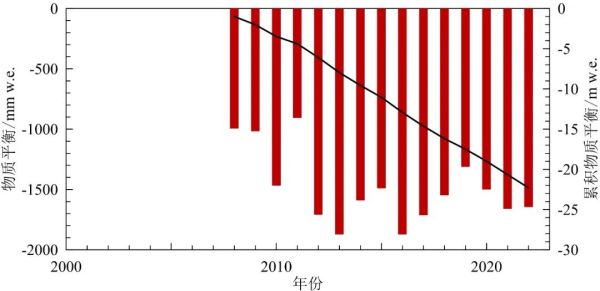 物質平衡(柱形圖)和累積物質平衡(曲線,相對于2008年)變化