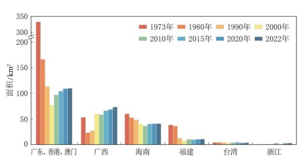中國紅樹林面積總體呈先減少后增加趨勢。1973~2000年,中國紅樹林面積減小,其中廣東、香港和澳門紅樹林面積減少最為明顯;2000~2022年,中國紅樹林總面積穩(wěn)步增加,至2022年已達到240平方公里,基本恢復至1980年水平,其中廣東、香港和澳門紅樹林總面積基本恢復至1990年水平。